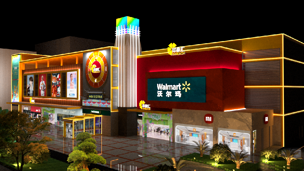 在具體方案中,設計團隊采用 "分層布光、主次呼應" 的策略:建筑主立面以 3000K 暖白光洗墻燈為基礎,通過精準的光束角控制,勾勒出簡潔大氣的建筑輪廓,既凸顯了現(xiàn)代商業(yè)建筑的利落線條,又與沃爾瑪超市的溫馨消費氛圍相適配;裙樓部分則創(chuàng)新采用暗藏式 LED 線條燈,沿商鋪招牌的邊緣有序排布,在夜間形成連貫的光影燈帶,既保證了商鋪標識的清晰呈現(xiàn),又避免了強光對行人的視覺干擾。這種設計既尊重了建筑原有結構,又通過燈光層次的變化,讓建筑在夜色中呈現(xiàn)出 "遠觀有輪廓,近賞有細節(jié)" 的視覺效果。