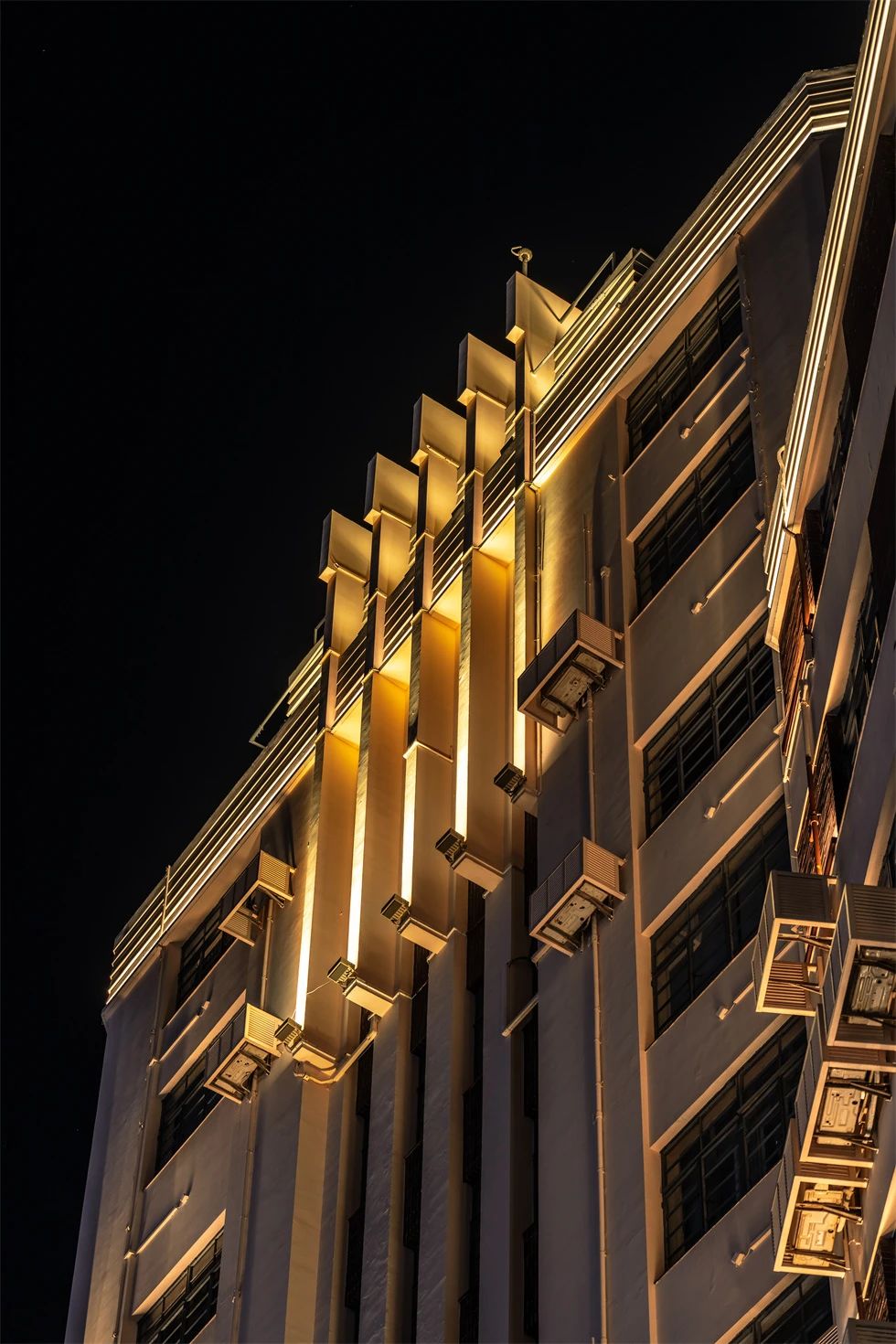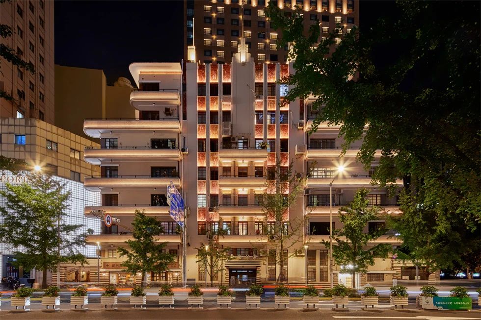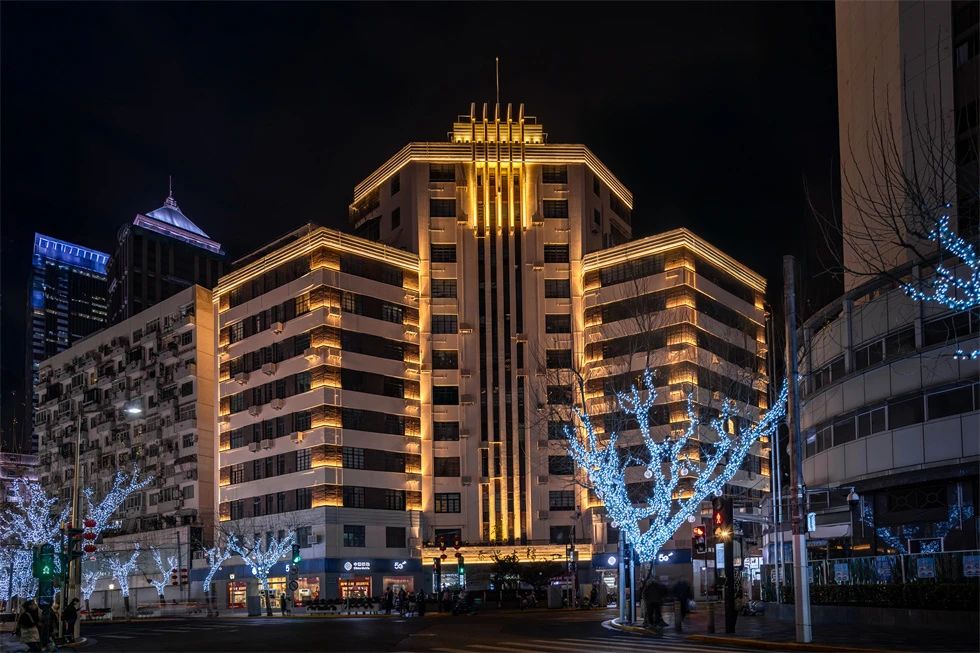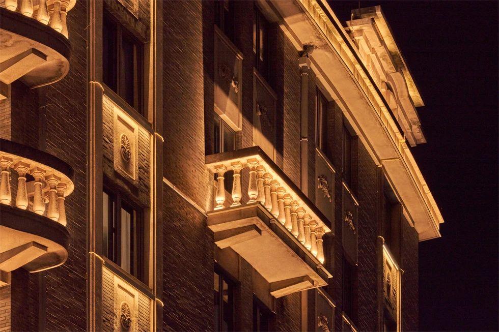 常德公寓為1936年竣工的裝飾藝術(shù)派風(fēng)格建筑,夜景重點(diǎn)表現(xiàn)其東立面,層層向上的燈光富有節(jié)奏地烘托中部豎向線條,柔和升起的水平線性燈光優(yōu)雅細(xì)膩地展現(xiàn)弧形伸展的陽臺(tái),配合搖曳發(fā)光的裝飾燈,典雅低調(diào),令人駐足。