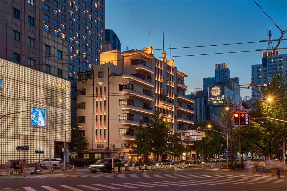 中央公寓位于泰興路路口,富有特色的轉(zhuǎn)角陽臺(tái)構(gòu)成了夜景的視覺中心,豎向貫通至頂。
