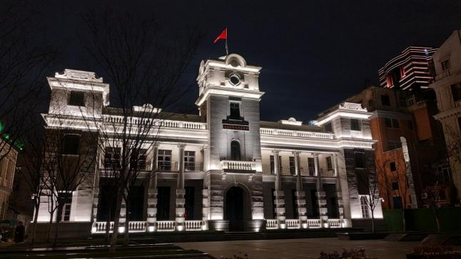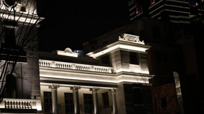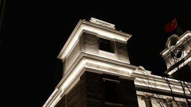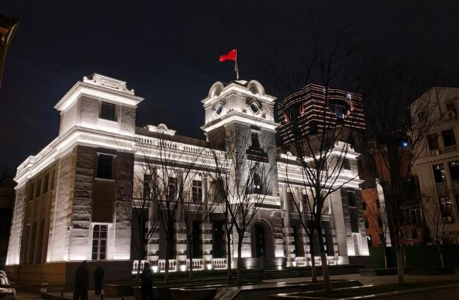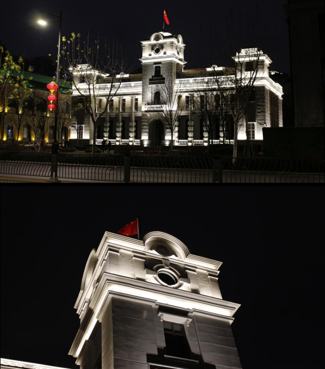 根據(jù)建筑自身特點,燈光布局明暗有序,層次分明,整體采用大面積泛光照明的手法,局部細節(jié)采用重點照明的手法,突出建筑細部節(jié)點構(gòu)造,體現(xiàn)建筑獨特的美感。光影由下至上,層次豐富。樓頂?shù)奈逍羌t旗高高飄揚,在夜間燈光的輔助下,形成視覺焦點,光彩奪目,莊重神圣。