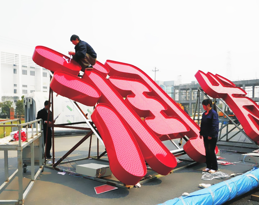 外露發(fā)光字,又稱沖孔發(fā)光字、穿孔發(fā)光字、燈珠字、外露led發(fā)光字、全彩led發(fā)光字等。是指在不銹鋼字、鋁字、鐵皮字等表面上沖孔裝上LED防水燈串。燈串顏色分為單色燈、七彩燈和全彩燈。常用于樓頂大字、門頭招牌。